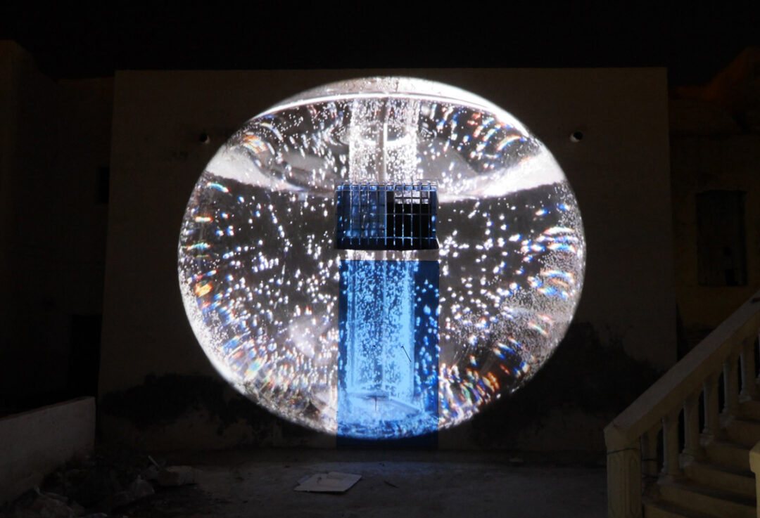 The French title „par hasard“ refers to the Arabic term „yasara“ for dicing, and is an example of the choice of therm the audio-visual composition is based on which are 15 Arabic and French terms, written and spoken. Both, audio and visual particles are animated to form a real-time environment. They are organized in groups that are linked in responding processes and that generate an endless series of variations in the present tense. The digital interaction is furthered through the application onto the architectural scape.